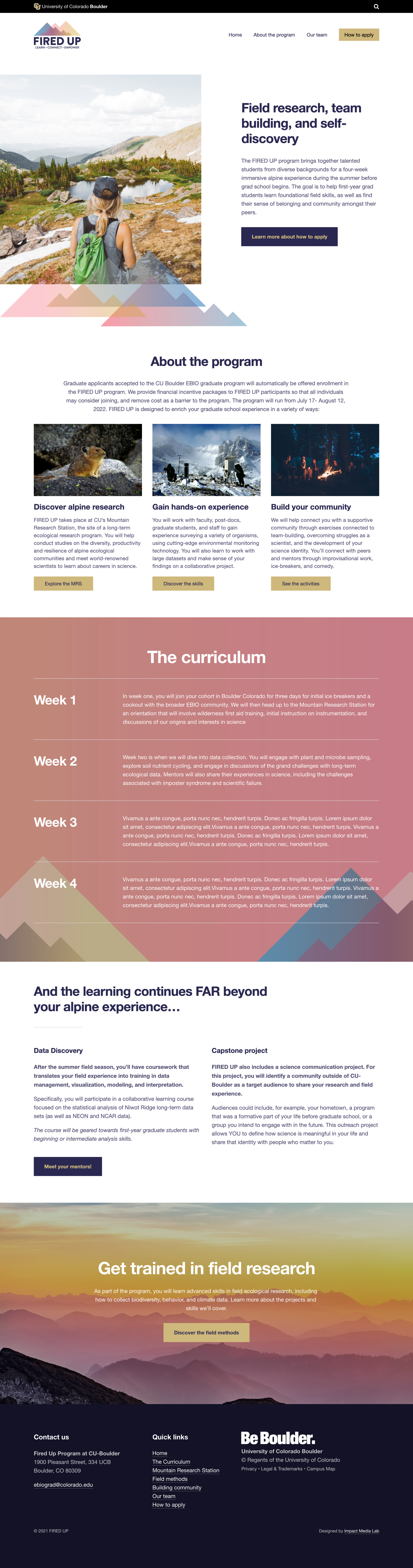 We wanted a brand that reinforced the warm and welcoming approach of the Fired Up program and celebrated their connection to science in mountain ecosystems. The biggest inspiration for the brand was their commitment to inclusivity and a better future in science, which we highlighted with a warm, sunrise-inspired palette. For this project, we created a logo series to help capture what we love about this bold initiative in graduate education.