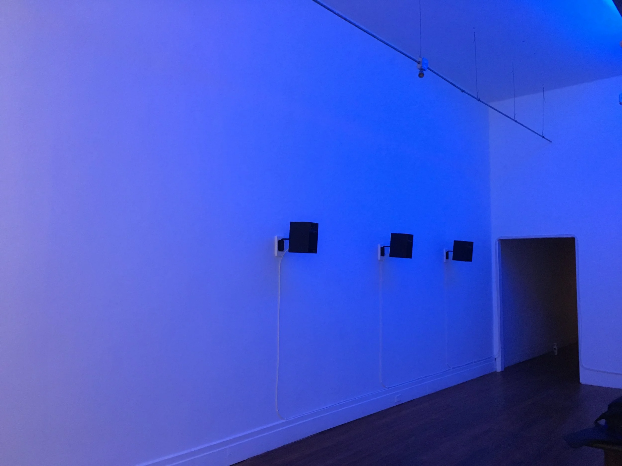 The recordings were made by Fowler-Finn and Vitiello in and around the grounds of Mountain Lake Biological Station, Pembroke, VA. Vitiello has created an immersive sound work in which sounds are grouped into four “chapters” that reflect insect vibrational songs heard within different temperature ranges — going from cool to hot. Each chapter of the sound mix is set to a color scheme in the gallery so that the listener knows when the lights are blue (for example) the sounds were recorded at a range of 17-18 Celsius. Accompanying info panels lead the listener through the biology and significance of vibrations, as well as the research that inspired the composition focusing on the role of the environment in the interaction and survival of these insects.