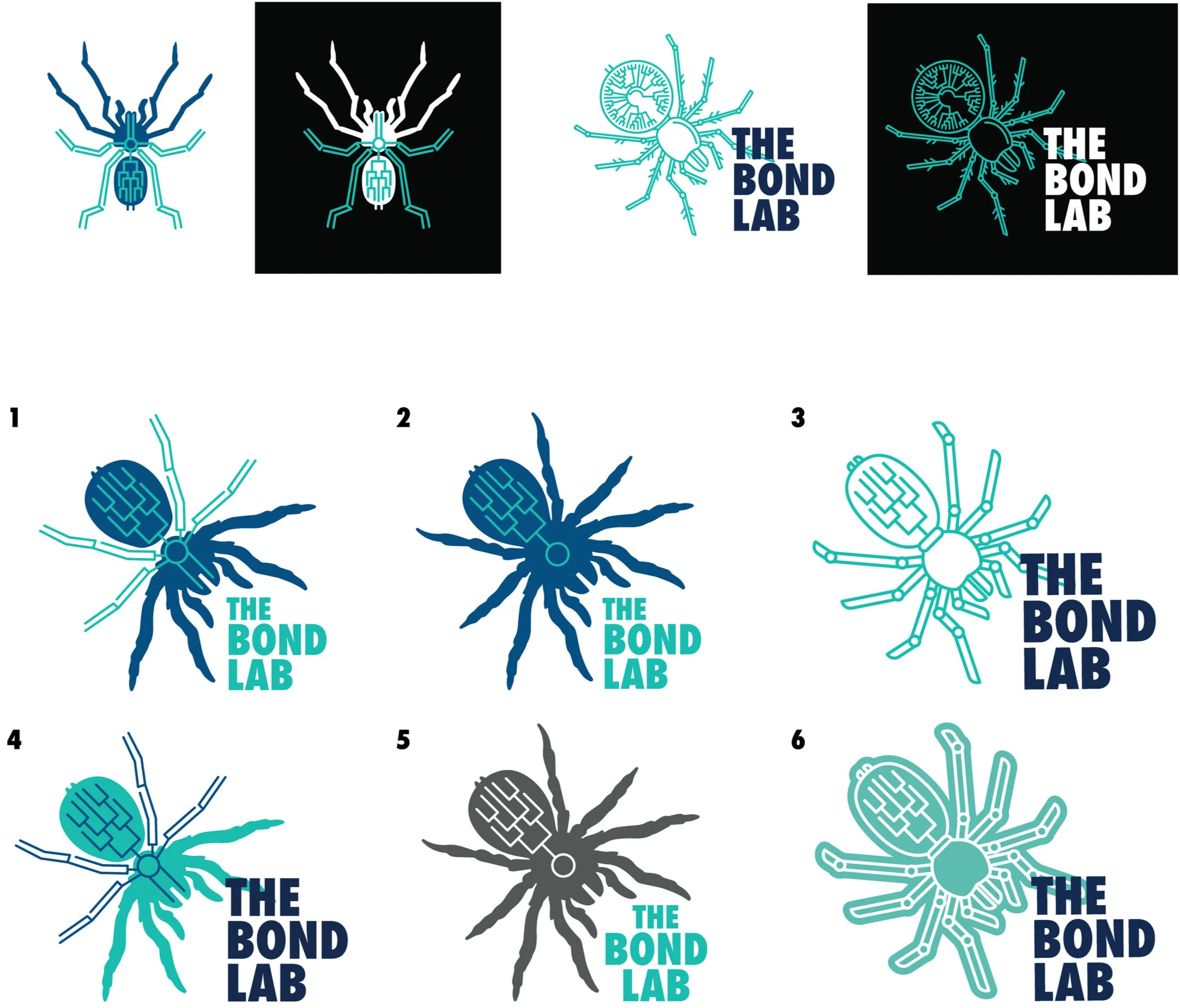 The Bond Lab explores the patterns and processes responsible for the diversity of life on Earth. They focus on terrestrial arthropods, with an emphasis on spiders and millipedes. The Bond Lab is futuristic, friendly, dynamic, and energetic. The brand is inspired by the power of new ideas, genomics, and spider silk.