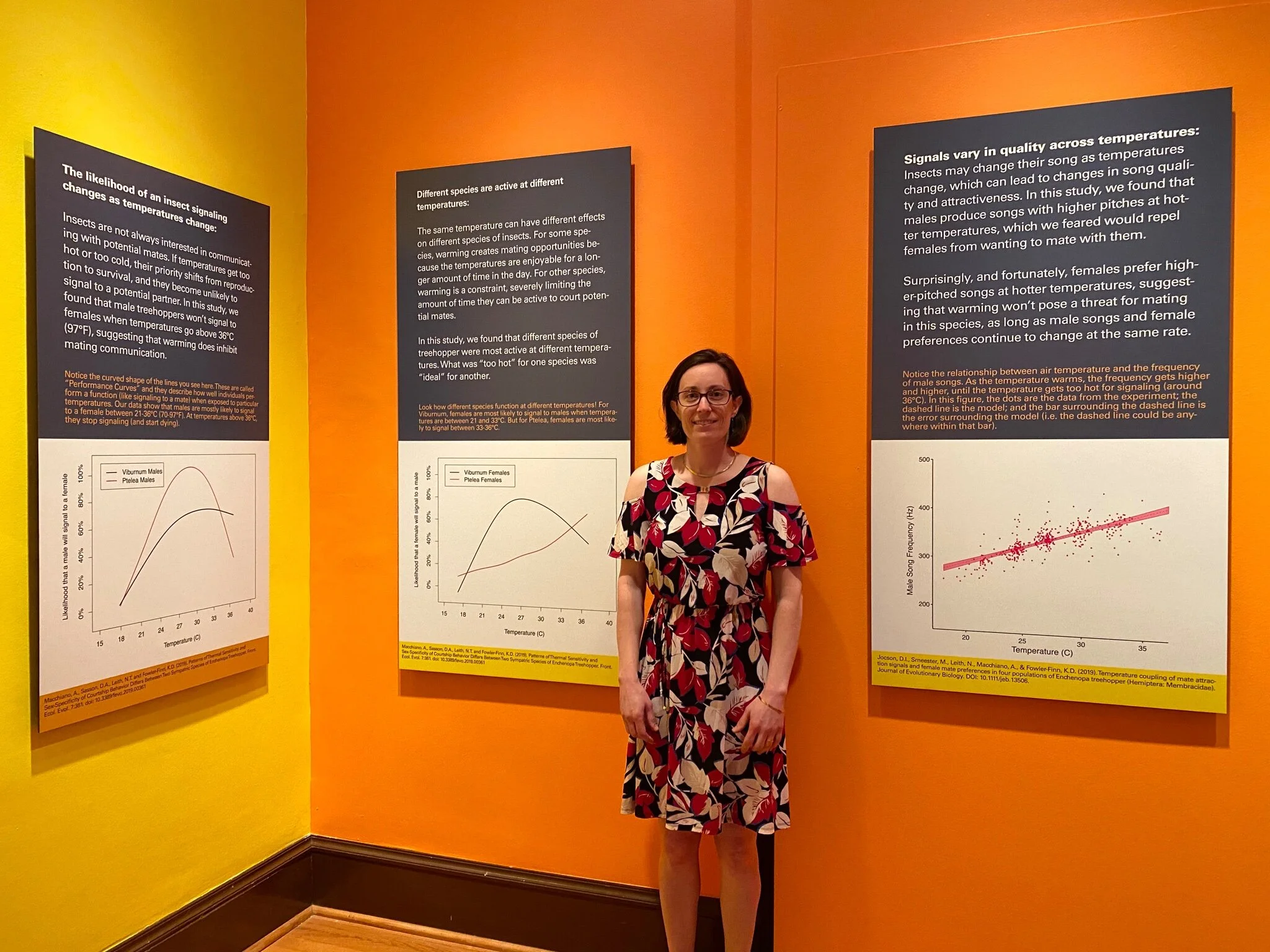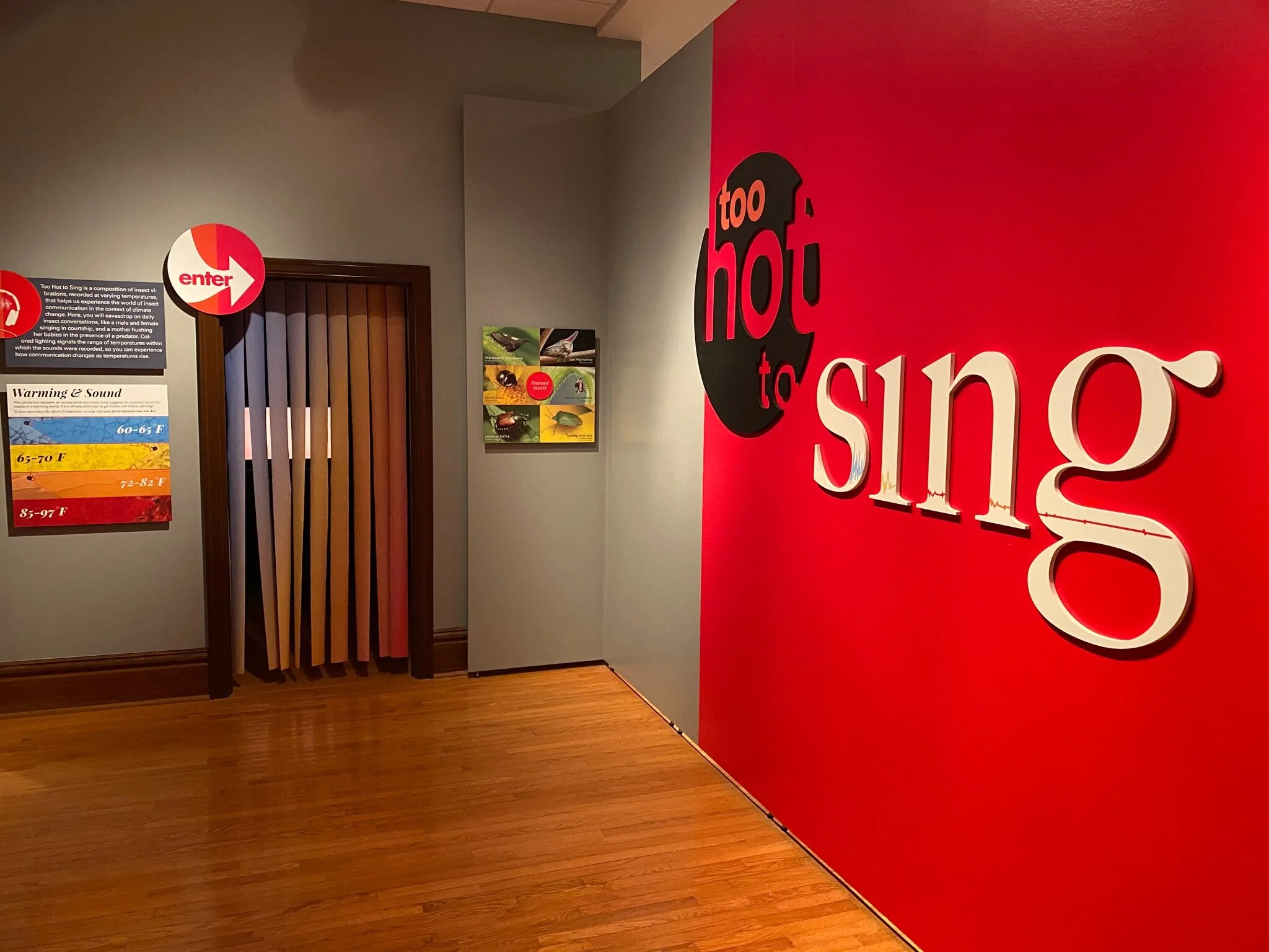 The exhibit is spread across 5 rooms . The first room provides an overview of the show and what to expect. The second room introduces the audience to the world of vibrational signaling, in insects and beyond. The third room focuses on what we know about climate change - its effects on animals and what we can do to slow it down. The fourth room dives deeper into Dr. Fowler-Finn’s research and her findings related to the effects of warming on insect communication. The 5th room features the sound installation, the climax of the exhibit, which uses colored lights to mark changes in compositions (blue, yellow, orange, and red).